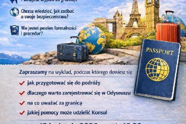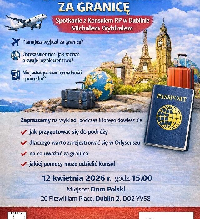 Wydział konsularny Ambasady RP w Dublinie, we współpracy z Domem Polskim oraz Towarzystwem Irlandzko-Polskim zaprasza na spotkanie z Konsulem RP, Michałem Wybiralem. Podczas wykładu dowiesz się m.in.: jakie zadania realizuje konsul? jak przygotować się do podróży zagranicznej? jakiej pomocy może udzielić ci konsul? Kiedy: Niedziela, 12 kwietnia 2026, godz.15:00 Gdzie: Dom Polski Dublin, 20 Fitzwilliam…