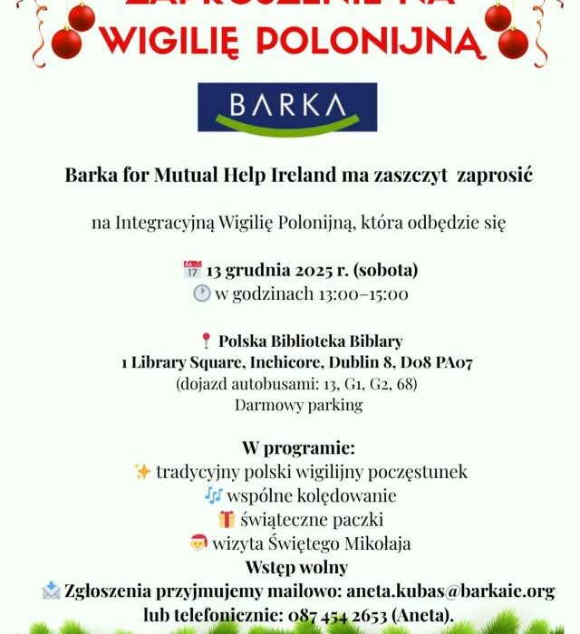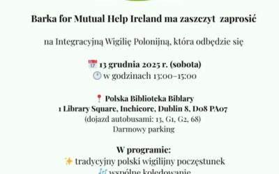 Fundacja Barka serdecznie zaprasza na Wigilię Integracyjną Polonii. Czeka nas wspólne, pełne ciepła i rozmów spotkanie przy świątecznym stole. 13 grudnia 2025 r. (sobota) w godzinach 13:00–15:00 Polska Biblioteka Biblary, 1 Library Square, Inchicore, Dublin 8, D08 PA07 (dojazd autobusami: 13, G1, G2, 68) Darmowy parking W programie: tradycyjny polski wigilijny poczęstunek wspólne kolędowanie świąteczne…