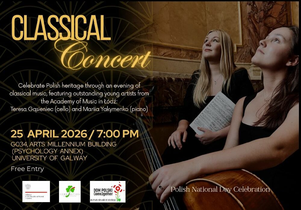 Są takie momenty w roku, kiedy wracamy do tego, co dla nas ważne. Do naszej historii, tożsamości i tego, co nas łączy. Właśnie taki wieczór chcemy stworzyć. Dom Polski w Galway, po raz pierwszy we współpracy z Ambasadą Rzeczypospolitej Polskiej w Dublin, ma zaszczyt zaprosić Państwa na wyjątkowy koncert muzyki Fryderyka Chopina oraz innych polskich…