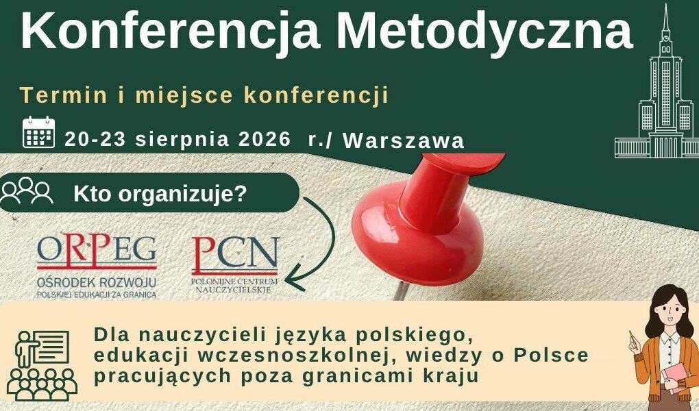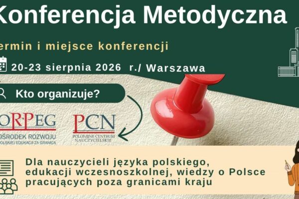 Ośrodek Rozwoju Polskiej Edukacji za Granicą zaprasza na stacjonarną konferencję metodyczną dla nauczycieli szkół polskich oraz nauczycieli pracujących wśród Polonii i Polaków za granicą. Miejsce: Warszawa Termin: 20–23 sierpnia 2026 r. To doskonała okazja do: uczestnictwa w inspirujących zajęciach i warsztatach, rozwijania kompetencji zawodowych, wymiany doświadczeń z nauczycielami z różnych środowisk, doskonalenia warsztatu metodycznego w…