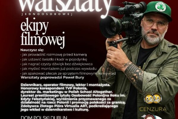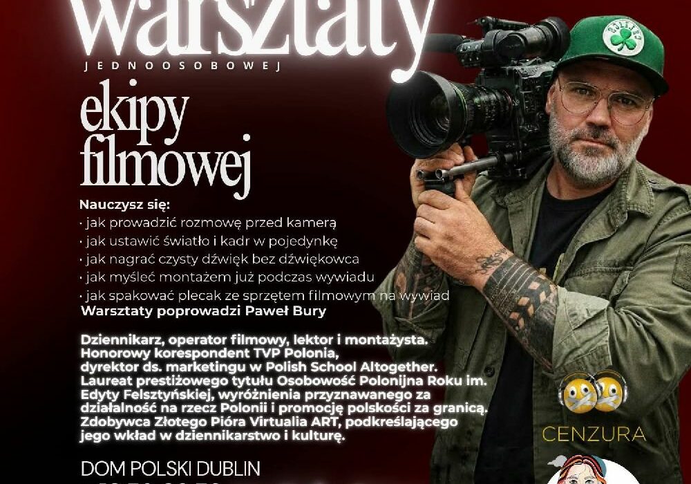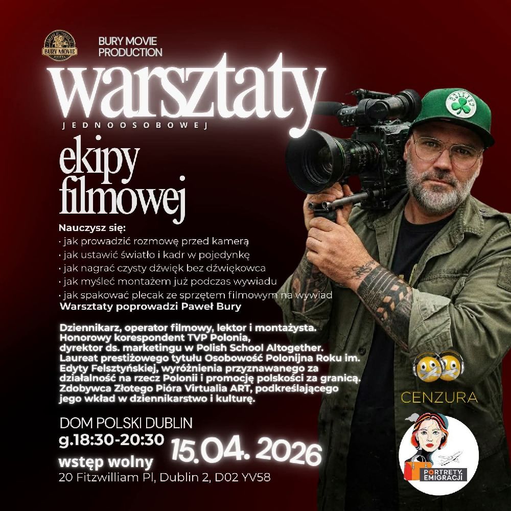 Zapraszamy na Warsztaty jednoosobowej ekipy filmowej. Warsztaty odbędą się 15 kwietnia 2026 r. w Domu Polskim w Dublinie (20 Fitzwilliam Pl, Dublin 2). Spotkanie poprowadzi Paweł Bury – dziennikarz, operator filmowy i montażysta. Zajęcia potrwają od 18:30 do 20:30. Udział w nich jest bezpłatny.