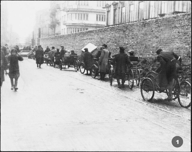 1. Ryksze na ul. Żelaznej zmierzające do getta, Archiwum Ringelbluma, ŻIH / Rickshaws on Żelazna street heading for the ghetto, the Ringelblum Archive, Żydowski Instytut Historyczny/Jewish Historical Institute;