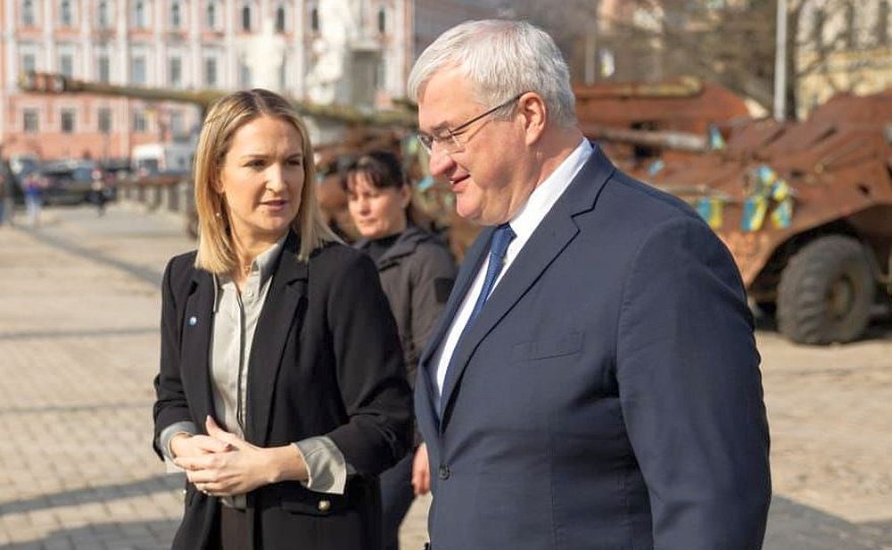 FOTO: Irlandzka minister spraw zagranicznych Helen McEntee i ukraiński minister spraw zagranicznych Andrij Sybiha w Kijowie 1 kwietnia br. podczas ceremonii złożenia kwiatów pod Ścianą Pamięci, upamiętniającą tych, którzy poświęcili życie w obronie Ukrainy, Twitter/X: @HMcEntee