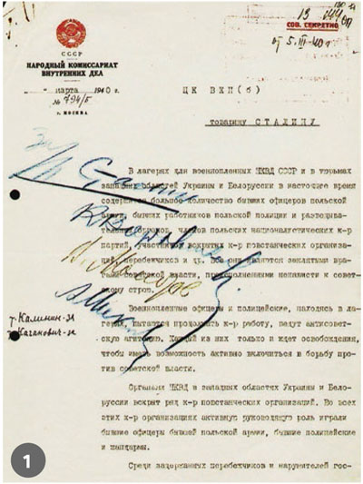 On March 5, 1940, based on the recommendation of Lavrientij Beria, chief of the NKWD in a letter to Stalin, the Politburo adopted a resolution to execute Polish officers imprisoned in POW camps in the USSR, in addition to other Polish prisoners from prison camps located in the western regions of Ukraine and Belarus: „given that they are all hardened, non-reformable enemies of Soviet authority, the NKWD considers it necessary . . . [this matter] be dealt with by issuing the highest penalty for them – execution. . . . Cases are to be dealt with without summoning the detainees and without presenting charges, the decision to close the investigation, nor the indictment . . . „. The document contained inter alia a list of 14, 700 former officers and officials, and 11,000 others imprisoned in Ukraine and Belarus.