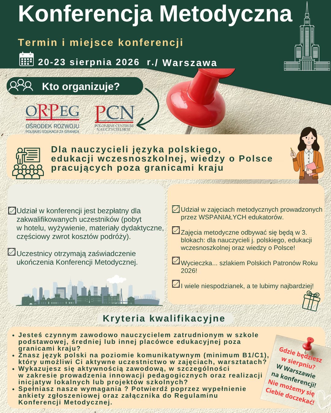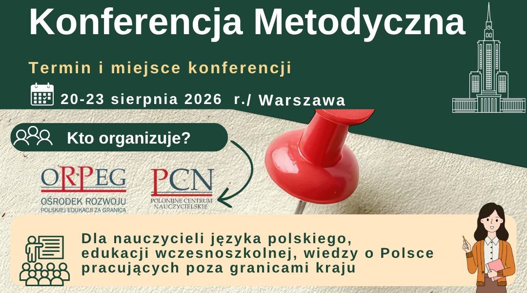 Ośrodek Rozwoju Polskiej Edukacji za Granicą zaprasza na stacjonarną konferencję metodyczną dla nauczycieli szkół polskich oraz nauczycieli pracujących wśród Polonii i Polaków za granicą.