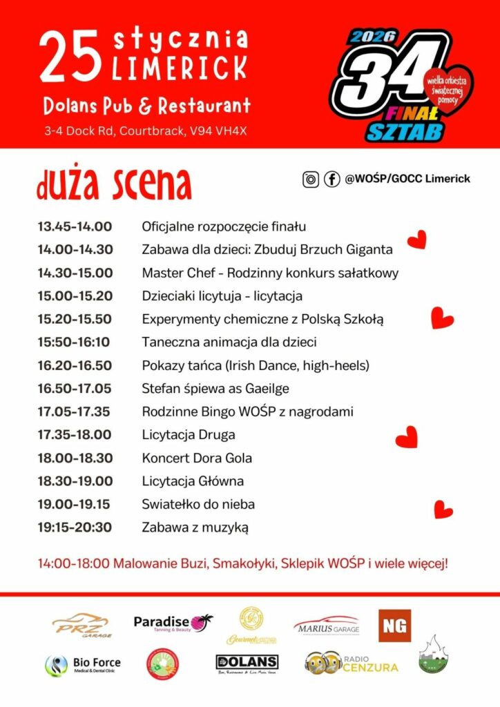 Finał Wielkiej Orkiestry Świątecznej Pomocy (WOŚP) odbędzie się w niedzielę, 25 stycznia 2026 r., w Dolans Pub & Restaurant w Limerick. Wydarzenie połączy społeczności różnych narodowości podczas całodniowej imprezy pełnej muzyki, atrakcji rodzinnych i zbiórki funduszy na rzecz zdrowia dzieci.